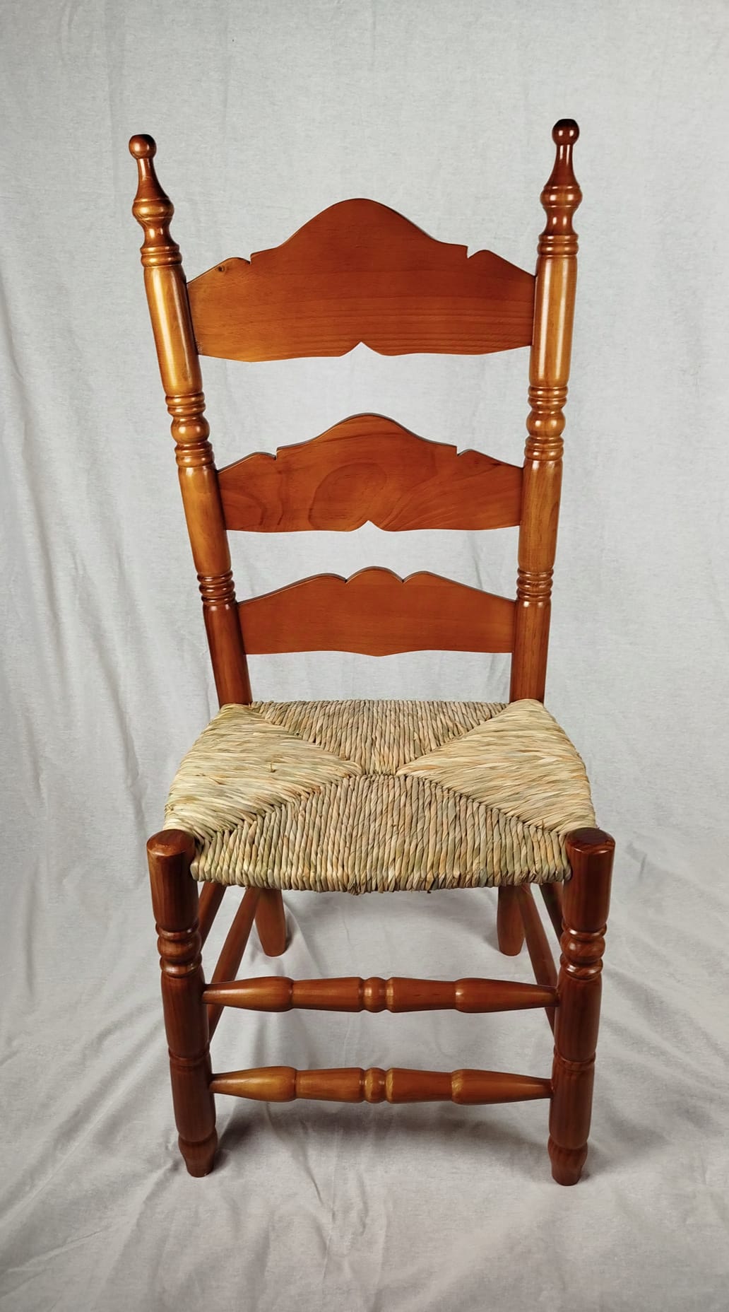 Silla en madera de Pino con Asiento tejido a mano de forma artesanal con enea natural . Terminación barnizado Miel. Medidas: Altura respaldo 110cm Asiento 46x43cm Altura al asiento 45cm Envío en Península incluido.