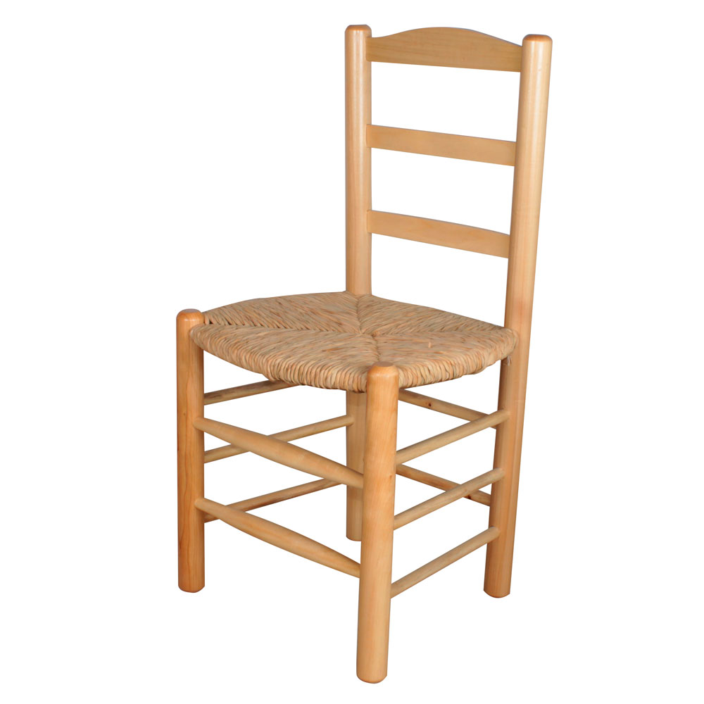 Silla en madera con asiento tejido a mano de forma artesanal con enea natural. Barnizado Incoloro. Medidas : Asiento 45x40cm, Altura Asiento 45cm, Altura Total 92cm