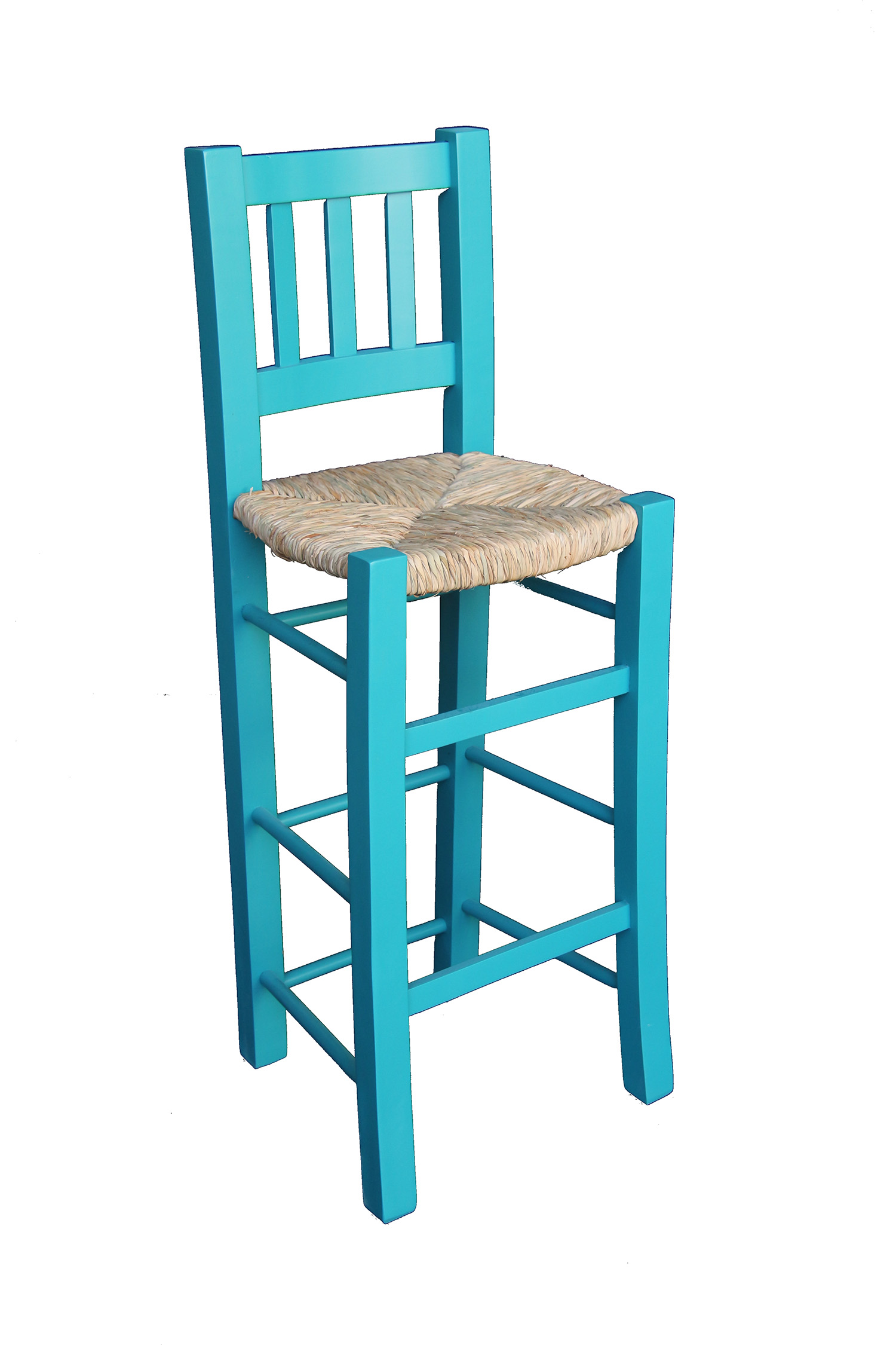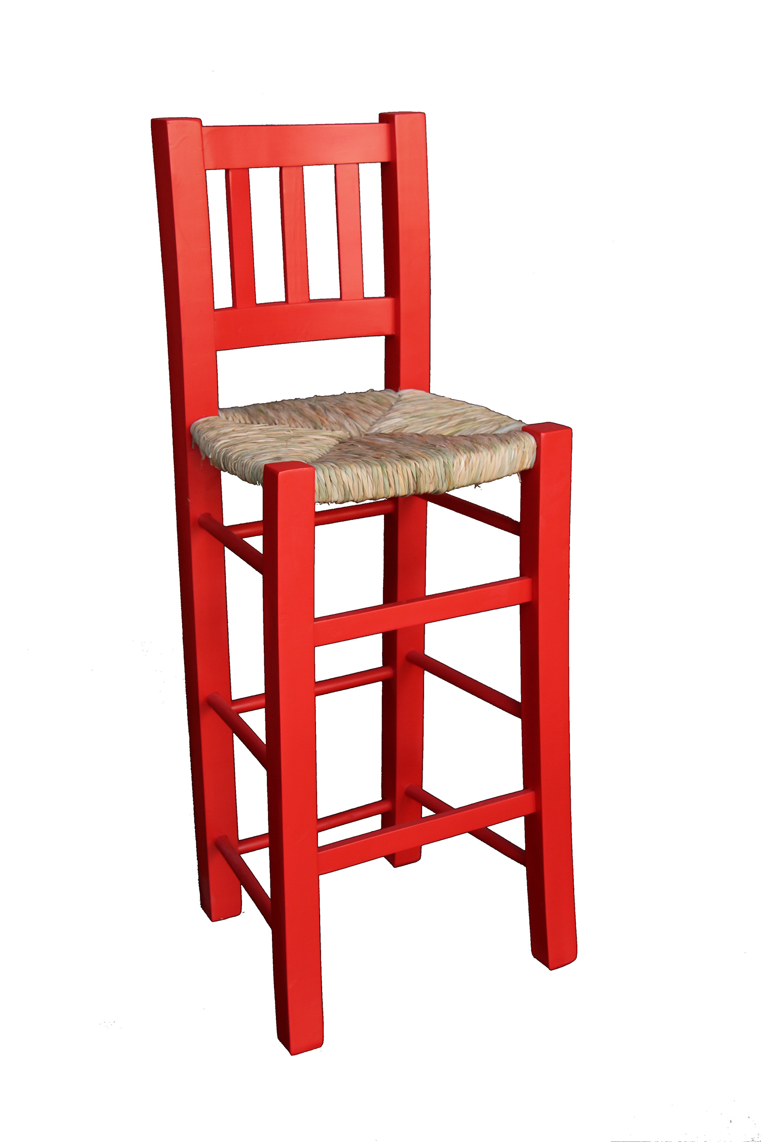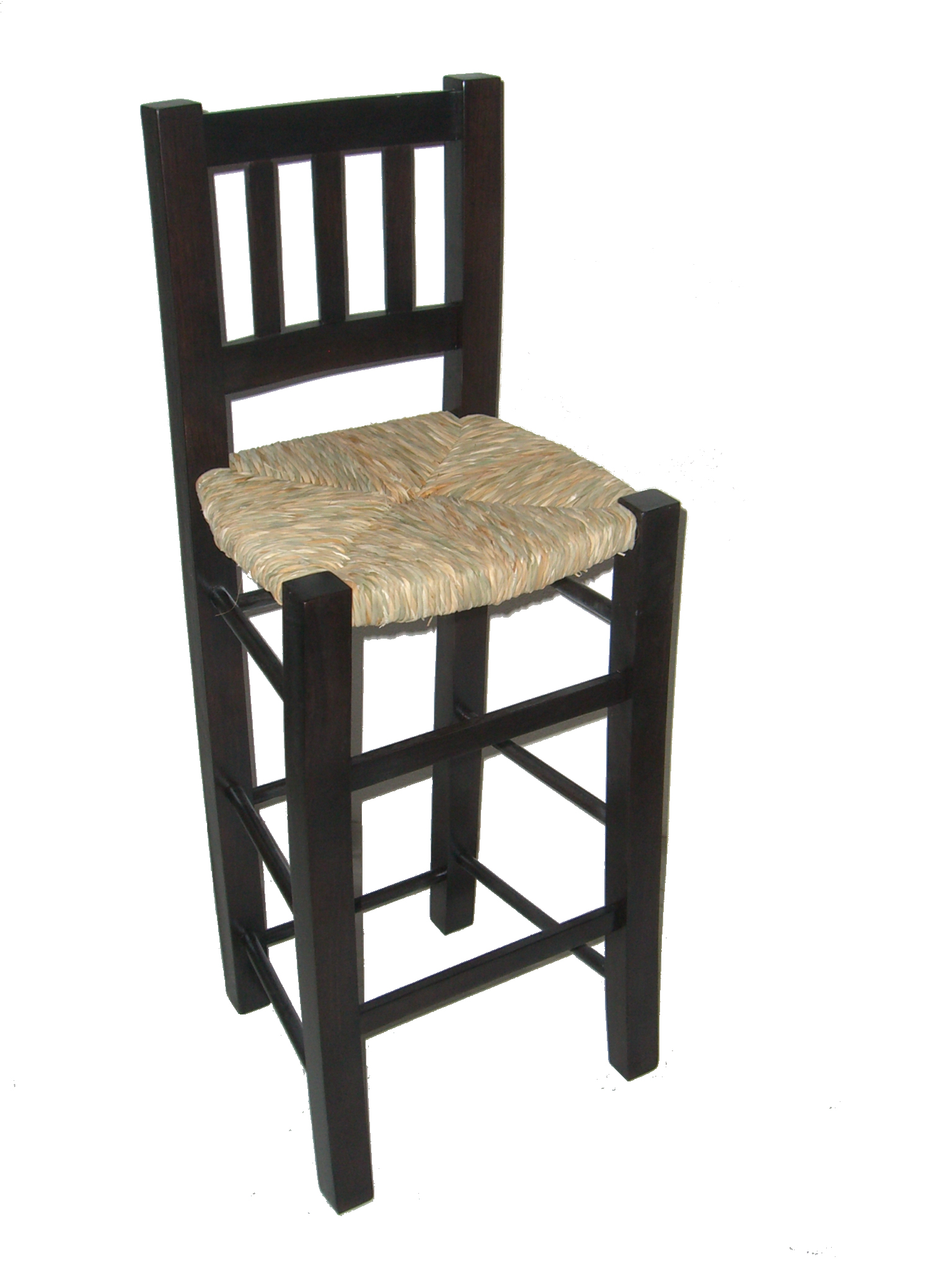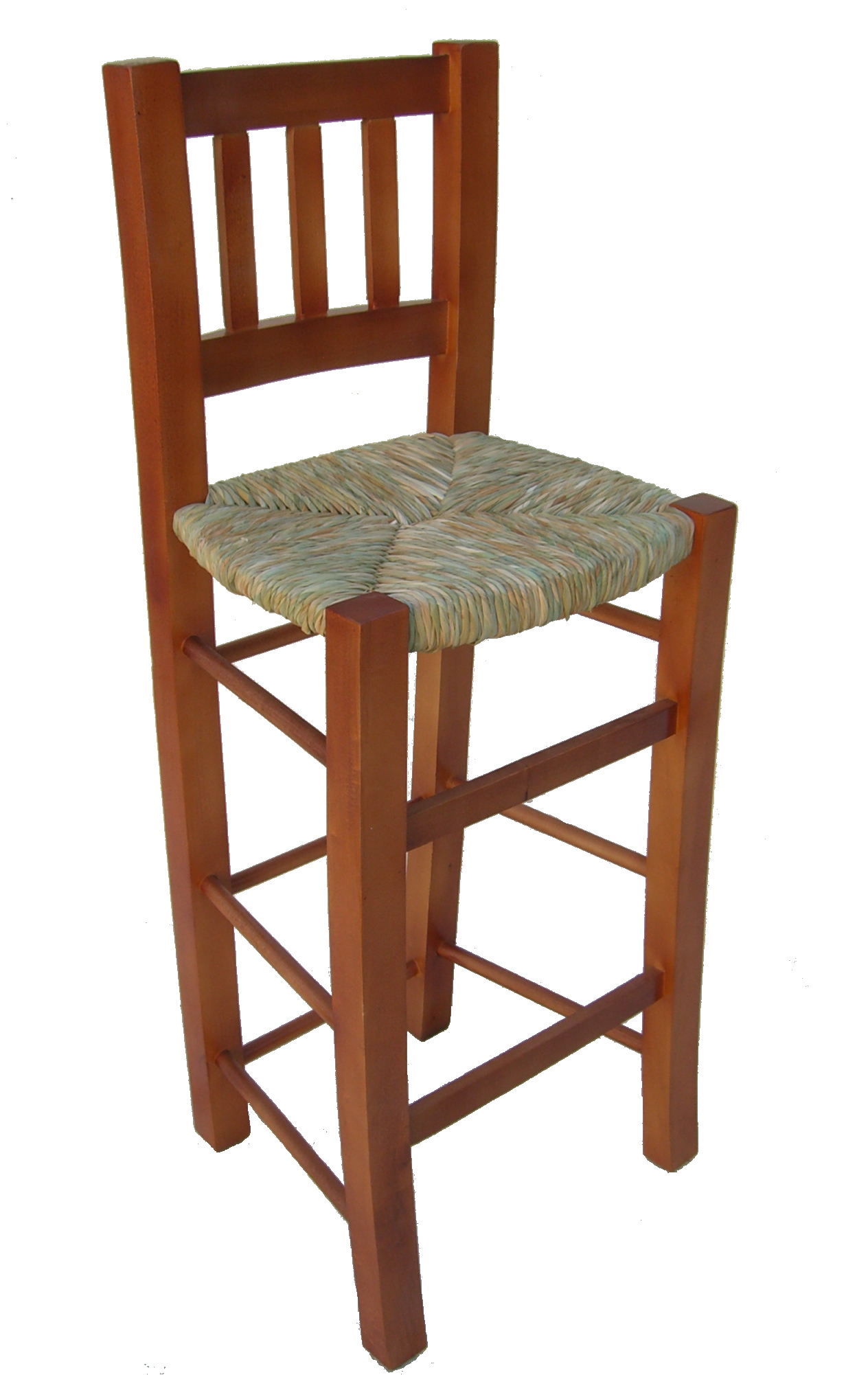 Taburete alto hecho en madera de chopo con asiento hecho a mano de forma artesanal con anea natural.